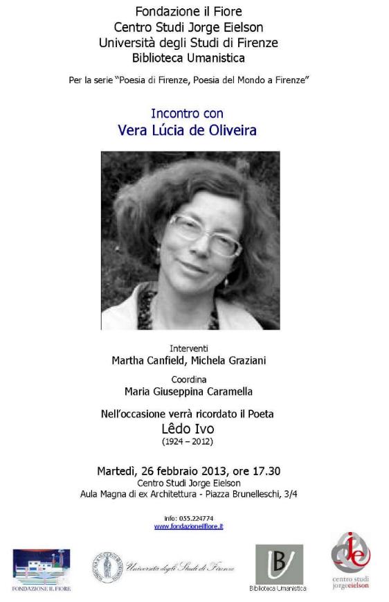 Fondazione il Fiore, Centro Studi Jorge Eielson, Universitŕ degli Studi di Firenze, Biblioteca Umanistica per la serie "Poesia di Firenze, Poesia del Mondo a Firenze" incontro con Vera Lúcia de Oliveira e ricordo del poeta Lędo Ivo (1924-2012) interventi di Martha Canfield e Michela Graziani, coordina Giuseppina Caramella Aula Magna Architettura, Piazza Brunelleschi, Firenze, 26 febbraio 2013 (foto di Claudio Maccherani) |
